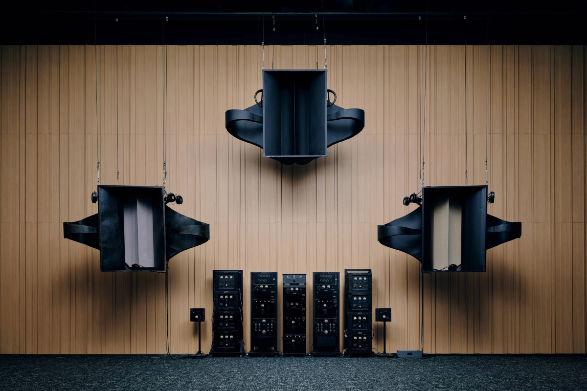 Transformations in Western Electric’s Horn Speakers from 1928 to 1937 Exhibition Room 5 showcases American theater audio systems from the 1930s, beginning with the Horn 15 behind you, produced in 1928. Horn 16, made in 1930, is also on display hanging from the ceiling opposite Horn 15. Large horn-type speakers like these were prevalent until the mid-1930s. However, by 1936, they were gradually replaced by the Mirrophonic system, which you can see displayed on your right. While Horn 15 was crafted by bending plywood boards, Horn 16 was constructed with plates. Horn 16 was typically installed in small theaters with shallow depth and narrow gaps between the screen and the back wall. After listening to some music, we will proceed next to Exhibition Room 6.