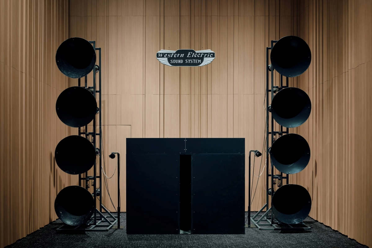 1920s The Straight Horn Speaker Exhibition Room 6 showcases the beginning of Western Electric audio history. Let's begin by listening to sound produced by a cone speaker, the 560-AW. This speaker, as shown on the top shelf, dates from a hundred years ago. The amplifier for this speaker, the 7-A model, is of the same age. Although its design differs from today’s speakers, this model can be considered the progenitor of modern speaker technology. The company behind this innovation, later expanded into the public address (PA) system market, providing sound systems for purposes such as election campaigns. The speaker hanging from the ceiling at the entrance of Exhibition Room 6 has a design recognizable to this day, particularly during election periods. The modern PA speakers you see today are nearly identical to those made a century ago, including the shape of the horns and their drivers. The 11-A speaker at your front was produced in 1924 and was used as an outdoor PA system. Audeum is the only place in the world where you can experience music through these historic PA horns. After a brief listen to a piece of music through the cone speaker, you will hear the same music in its entirety through the 11-A sound system. Once the music ends, please proceed to the next exhibition room.