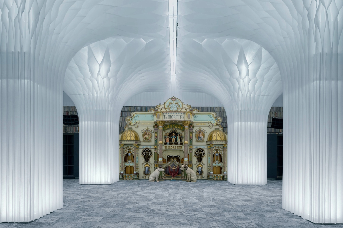 B2F Lounge In the lounge, you will be given the opportunity to listen to a variety of music for 30 minutes. The audio system in this room is the Mirrophonic M1, the largest model from the Mirrophonic series. Remarkably, a single speaker of this model was used to fill a 3,500-seat theater with sound. When paired, a set of left and right speakers can provide sound coverage for a theater with a capacity of approximately 7,000 seats. In between the M1 is a large Mortier organ which was built over 100 years ago. Another stand-out feature of this room is our collection of over 100,000 LPs. With this we now end the audio guide. We hope you enjoy the rest of your time at Audeum.